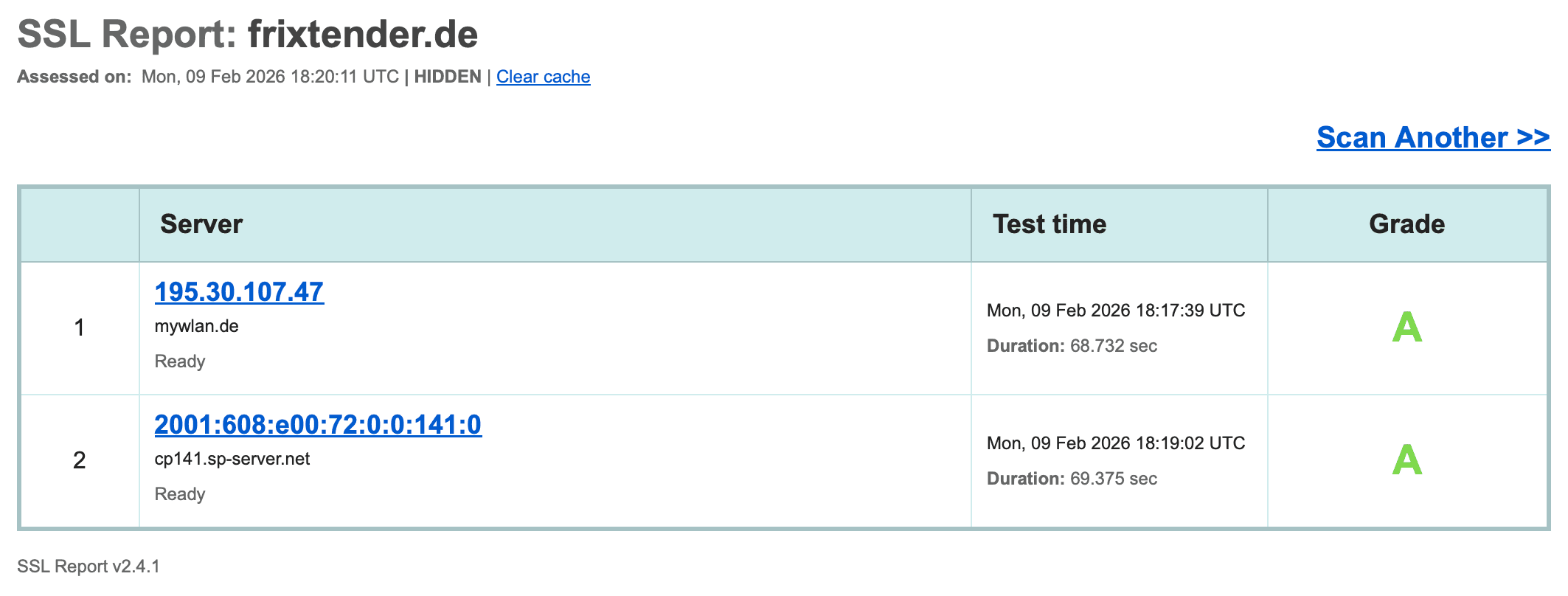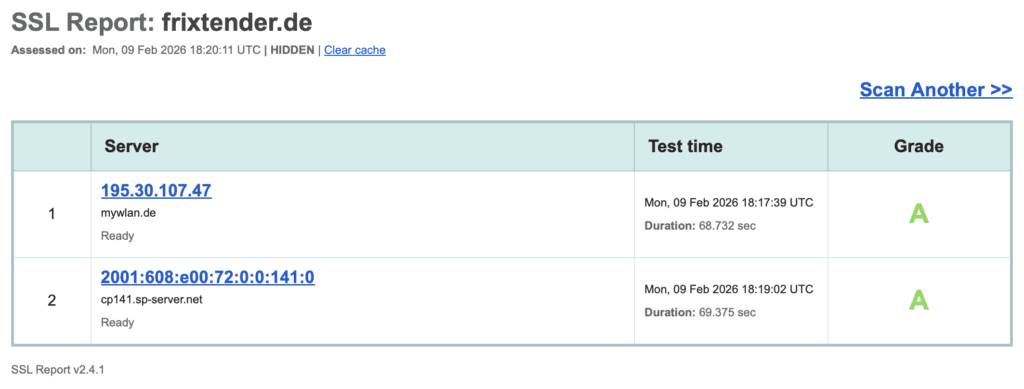 Unsere Seite hat ein exzellentes A-Rating bei Qualys SSL Labs (Stand 09.02.2026):